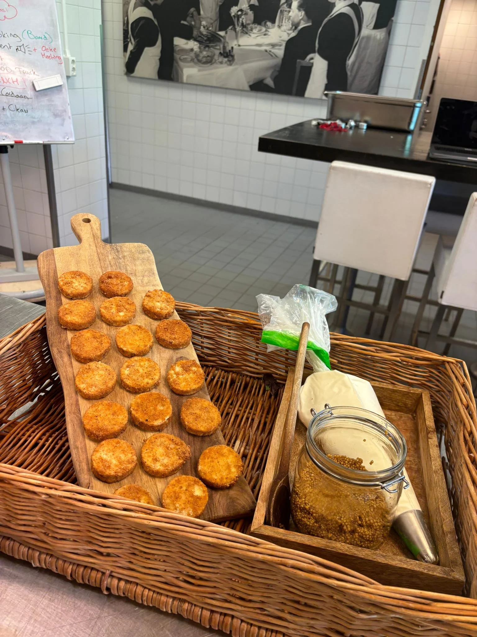 The journey began with an amuse, served directly onto the guest’s hand as they entered — a delicate courgette crisp from the Hotelschool gardens, topped with goat cheese mousse from a local farm and finished with honey-balsamic mustard pearls. A small bite, yet one that gave each person their own moment of attention.