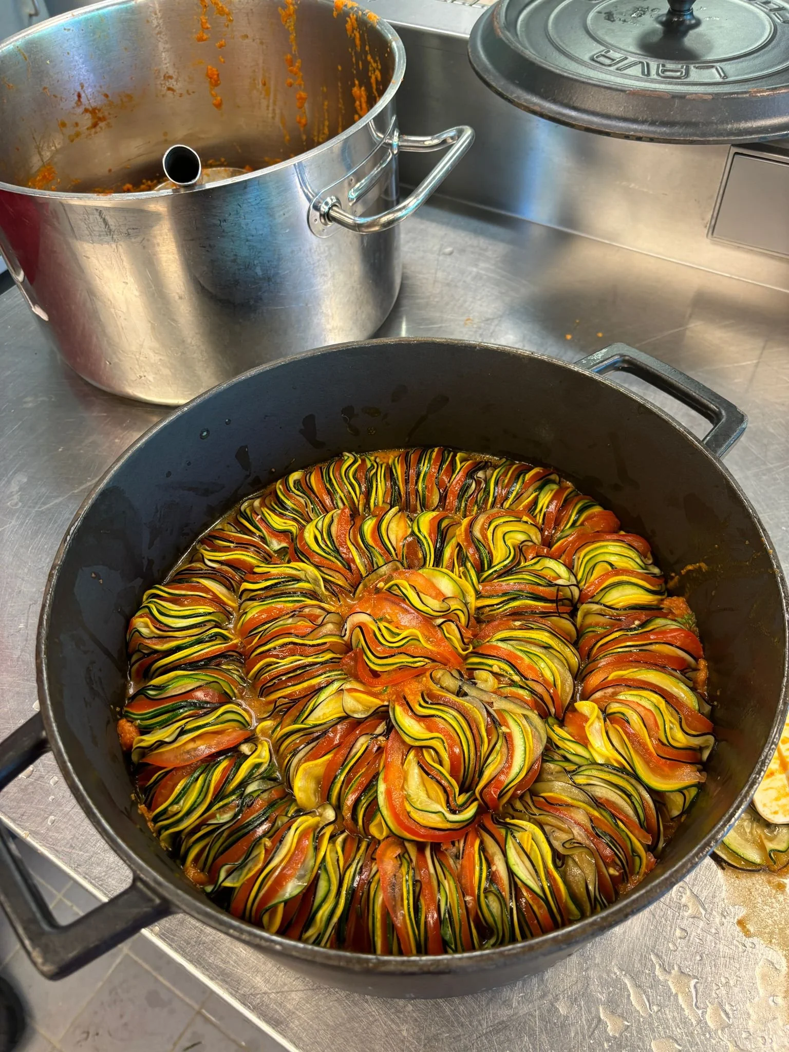 For the main course, I chose the most iconic expression of French seasonality: Ratatouille. Each slice of aubergine, tomato, courgette, and bellpepper was seasoned individually, pressed to remove liquid, and layered with care over a refined red sauce. Finished with basil oil and a single chive, it was both humble and elevated, the countryside dish reborn with elegance.